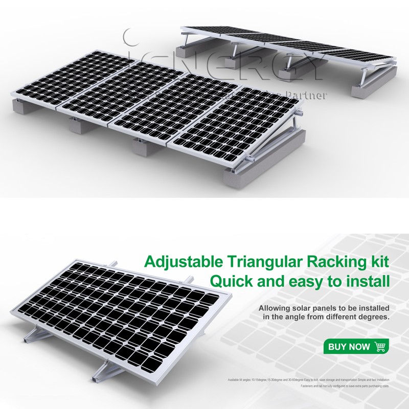 IENERGY Adjustable Triangular Racking Kit is quick and easy to install, allowing solar panels to be installed in the angle from 10 to 15 degrees,15 to 30 degrees and 30 to 60 degrees.